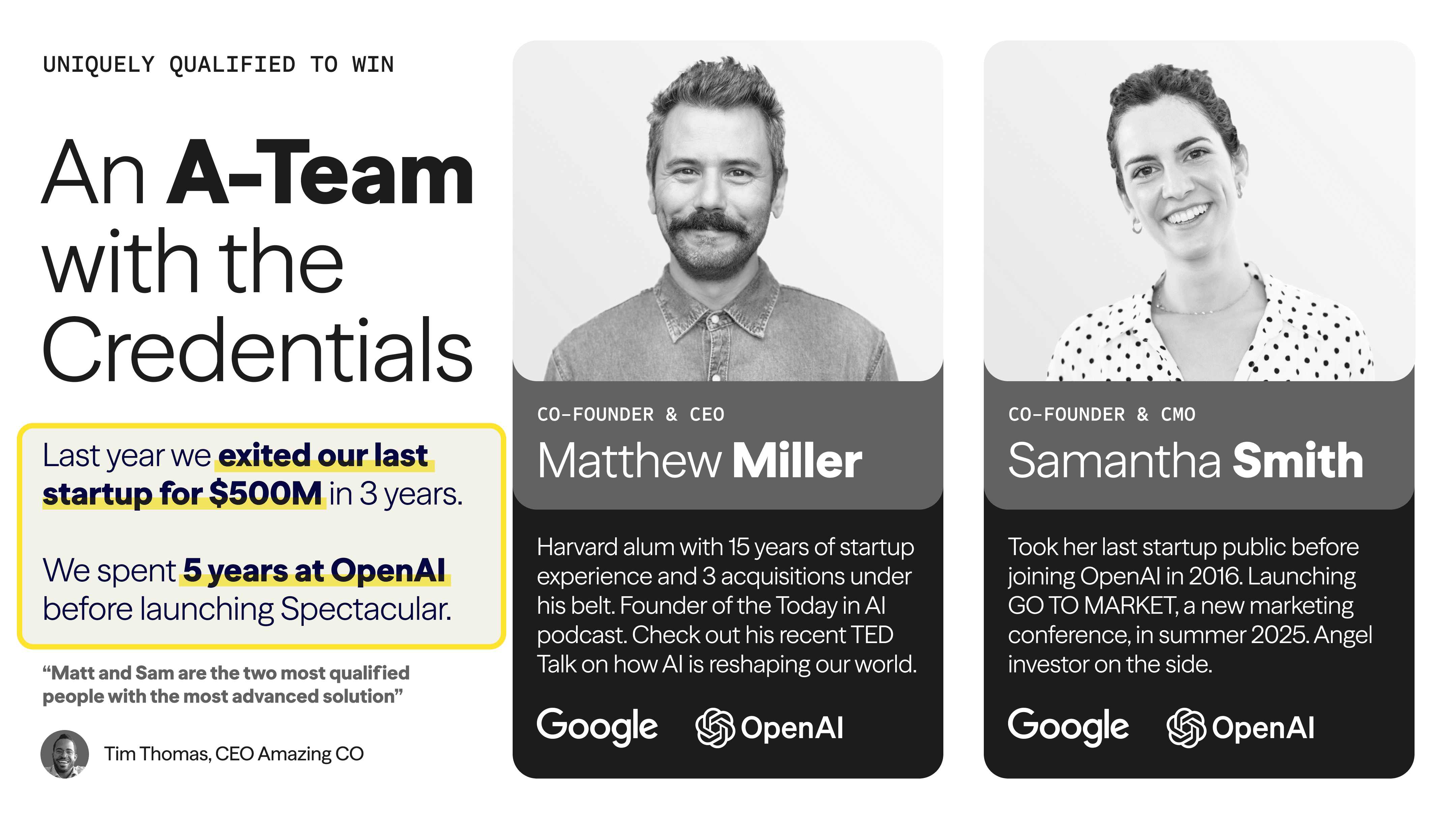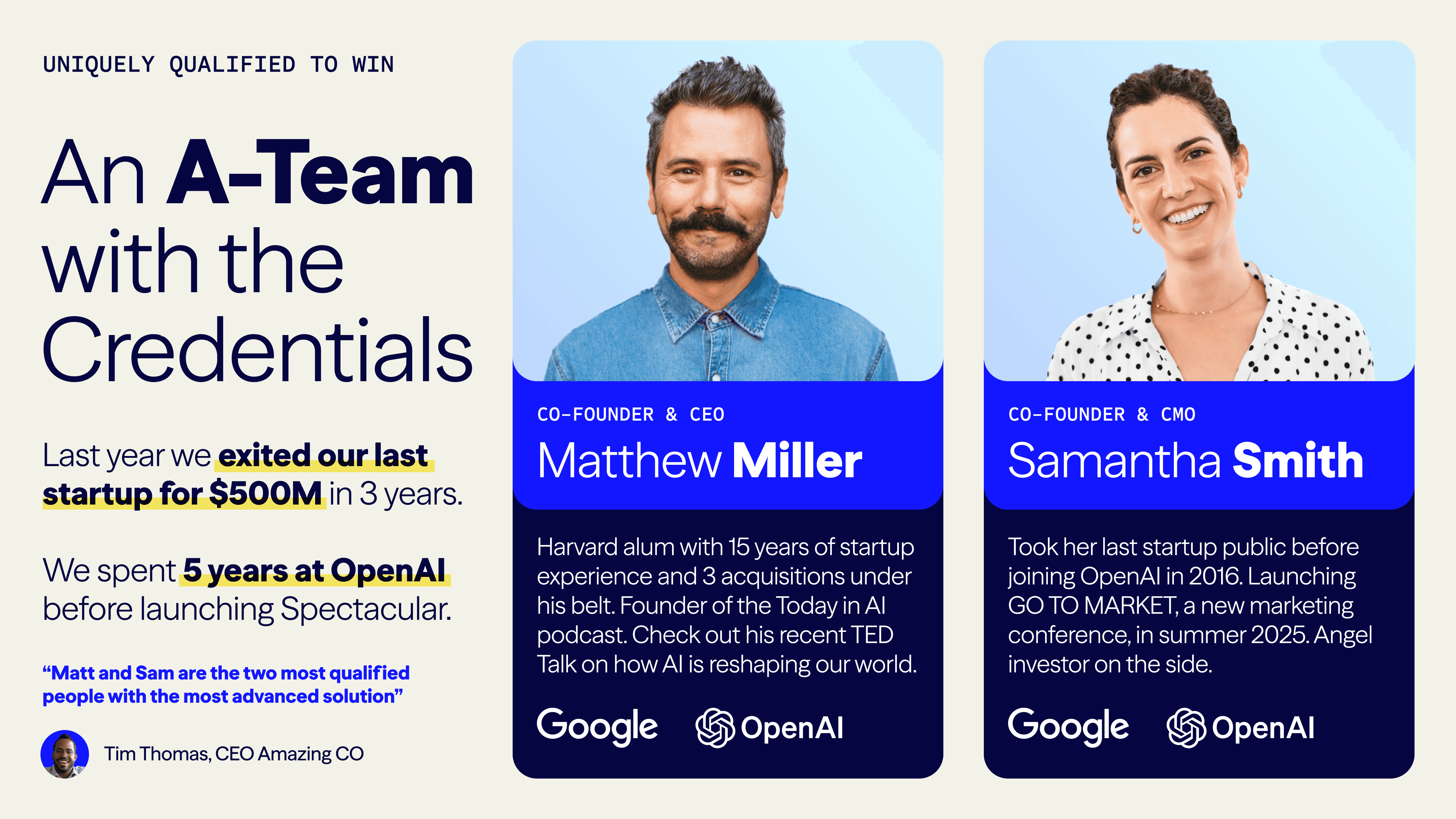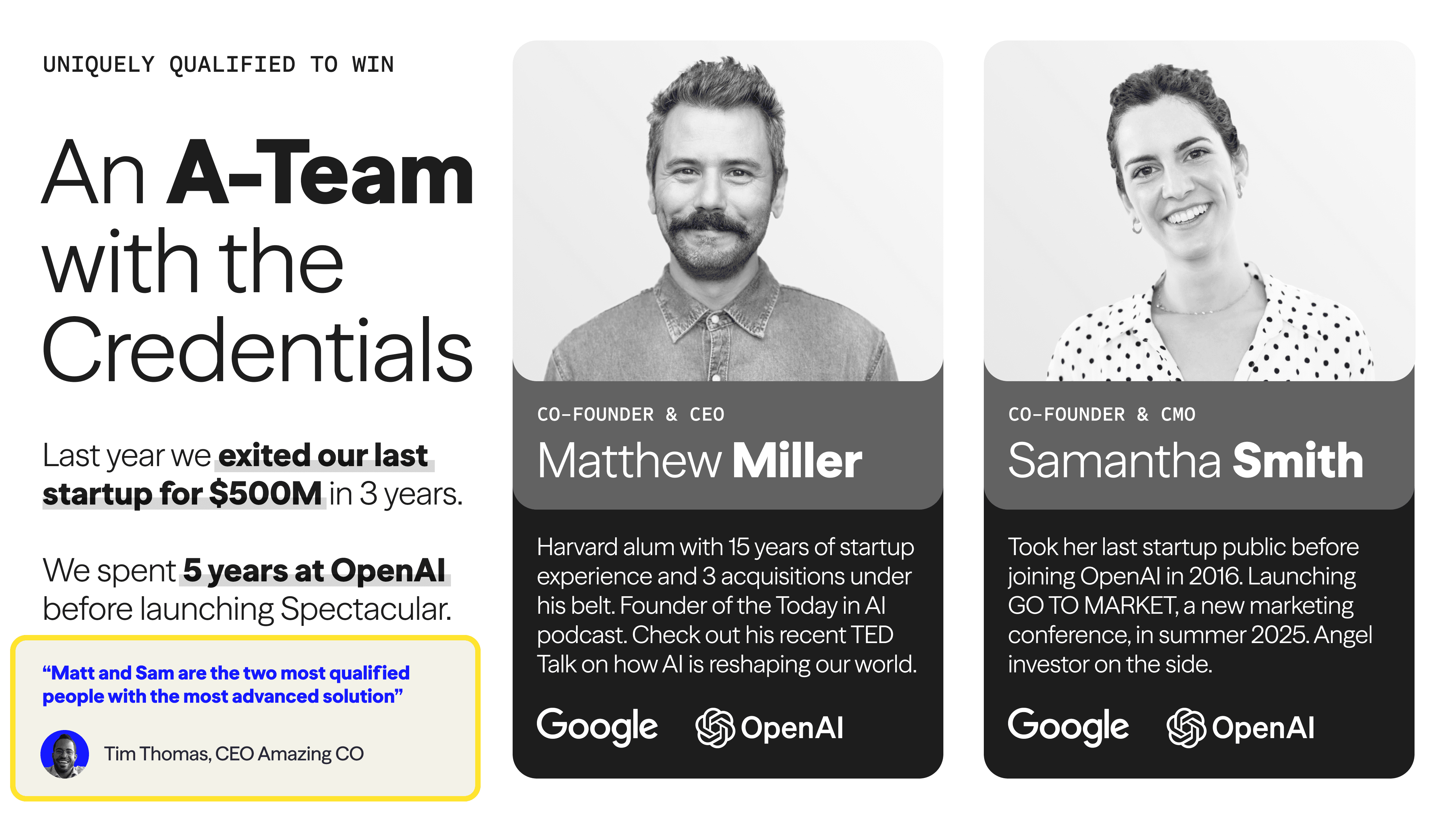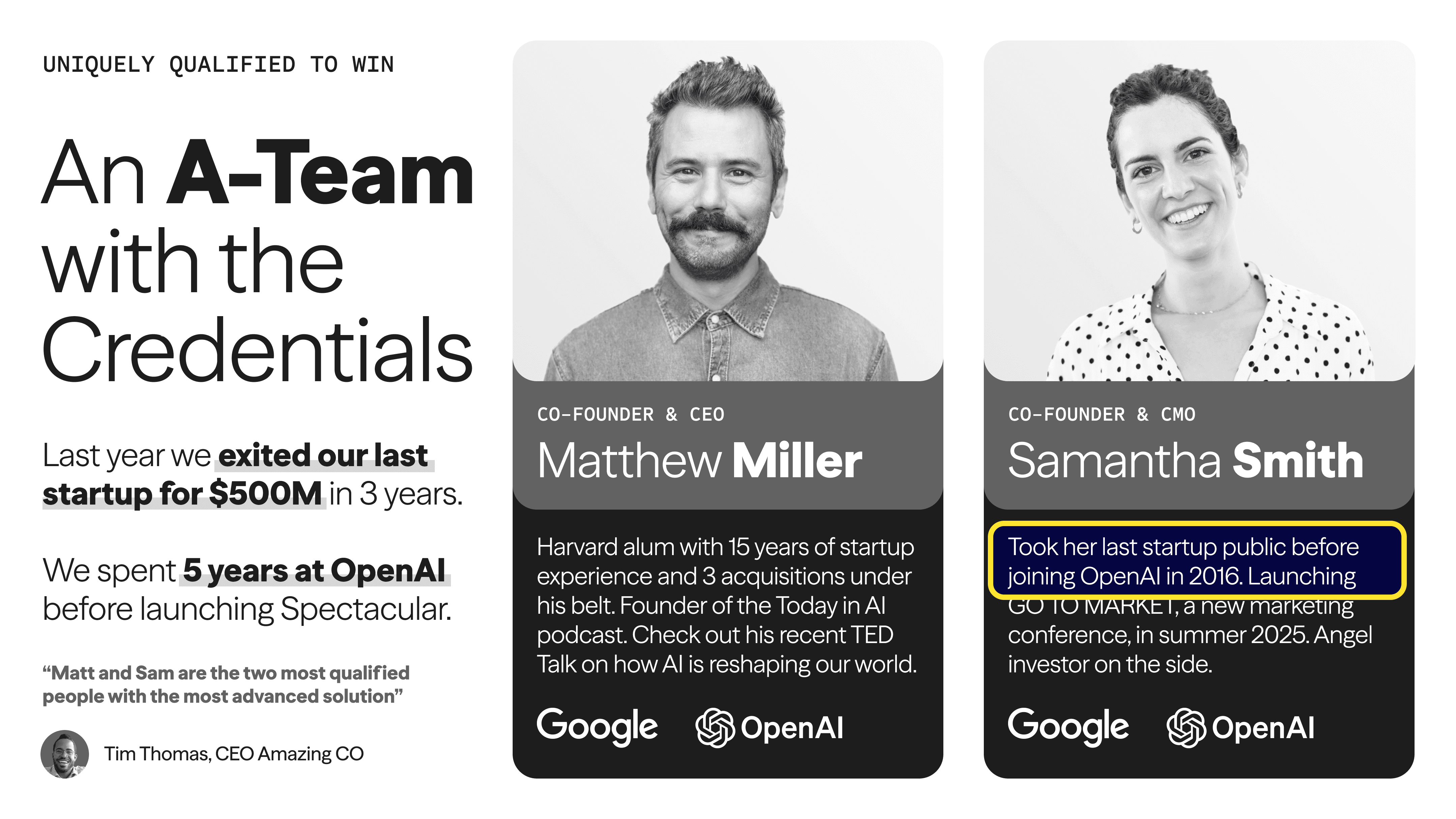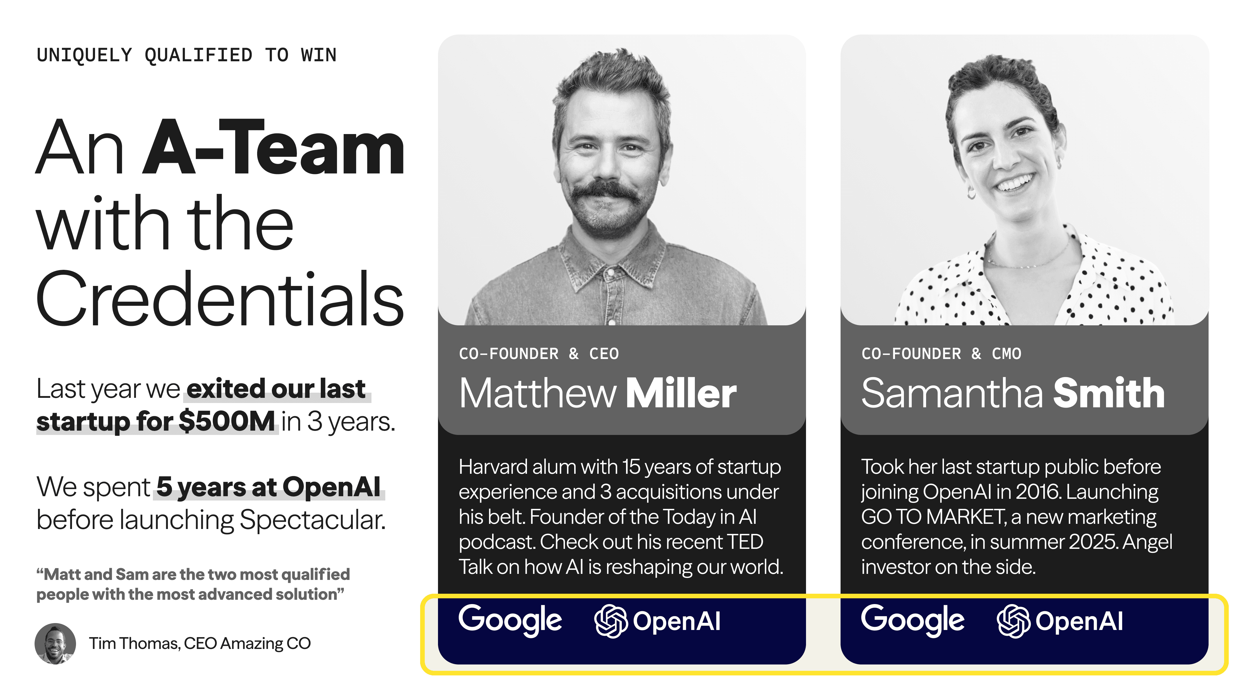 Whether you're raising your seed round or building trust on your About page, the team section is where you prove: